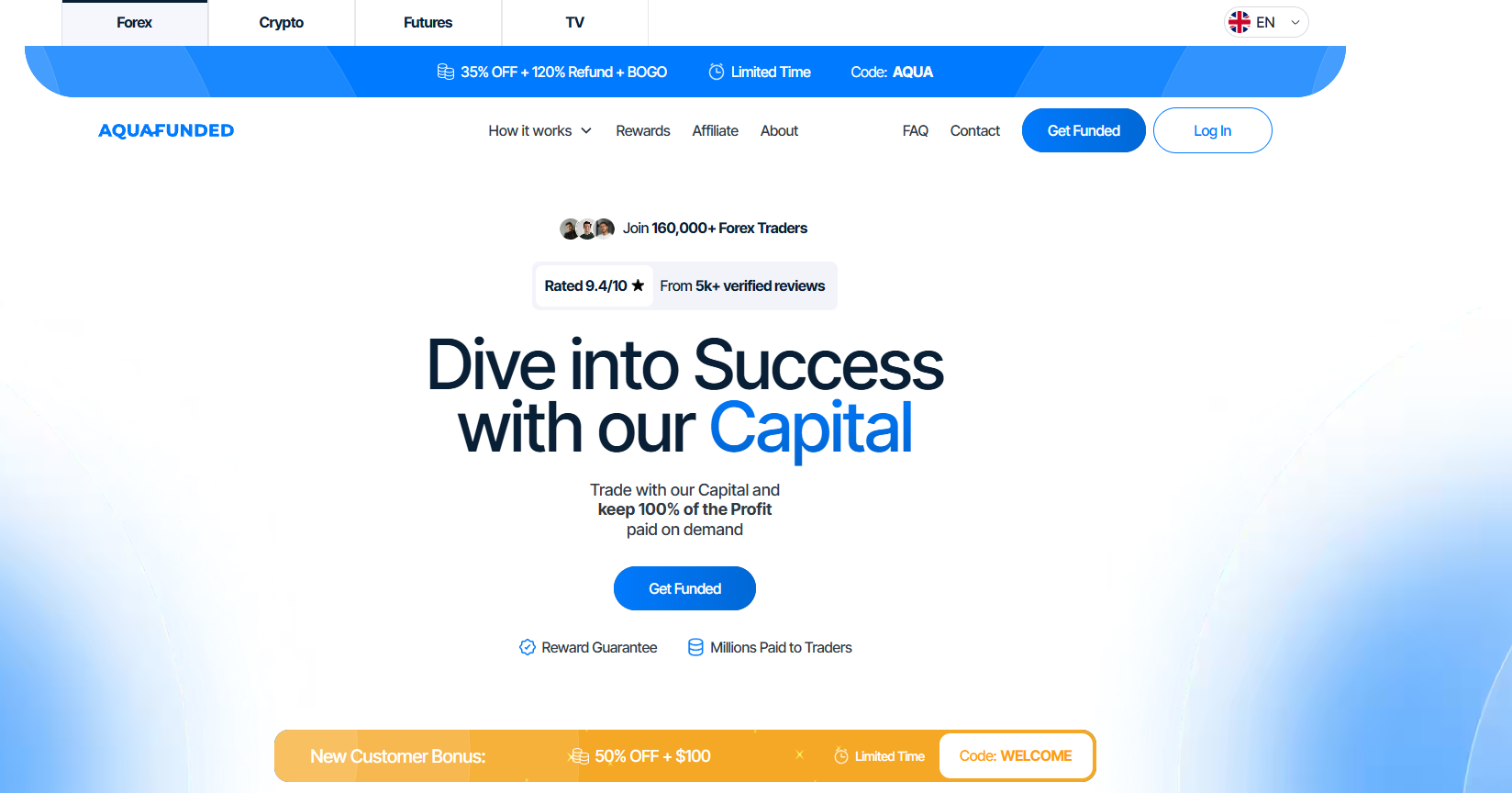 Aqua Funded operates from Dubai and has grown faster since its 2023 founding, now working with over 160,000 traders worldwide. The firm maintains a 9.4/10 rating from more than 5,000 verified reviews. Account sizes span from $5,000 to $400,000, with potential scaling to $4 million for top performers.